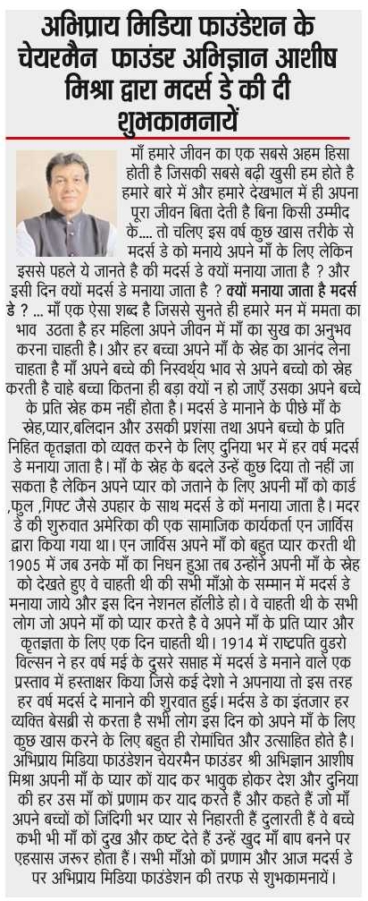 अभिप्राय मीडिया फाउंडेशन मदर्स डे विशेष ब्लॉग सिटी चीफ न्यूजपेपर में प्रकाशित। देखने के लिए क्लिक करें.