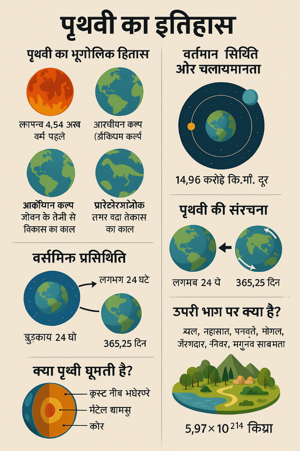 पृथ्वी का इतिहास, भूगोलिक दृष्टि से देखा जाए तो यह लगभग 4.54 अरब वर्ष पुरानी है। इसका विकास विभिन्न भूगर्भीय और खगोलीय प्रक्रियाओं से हुआ है। पृथ्वी का ....